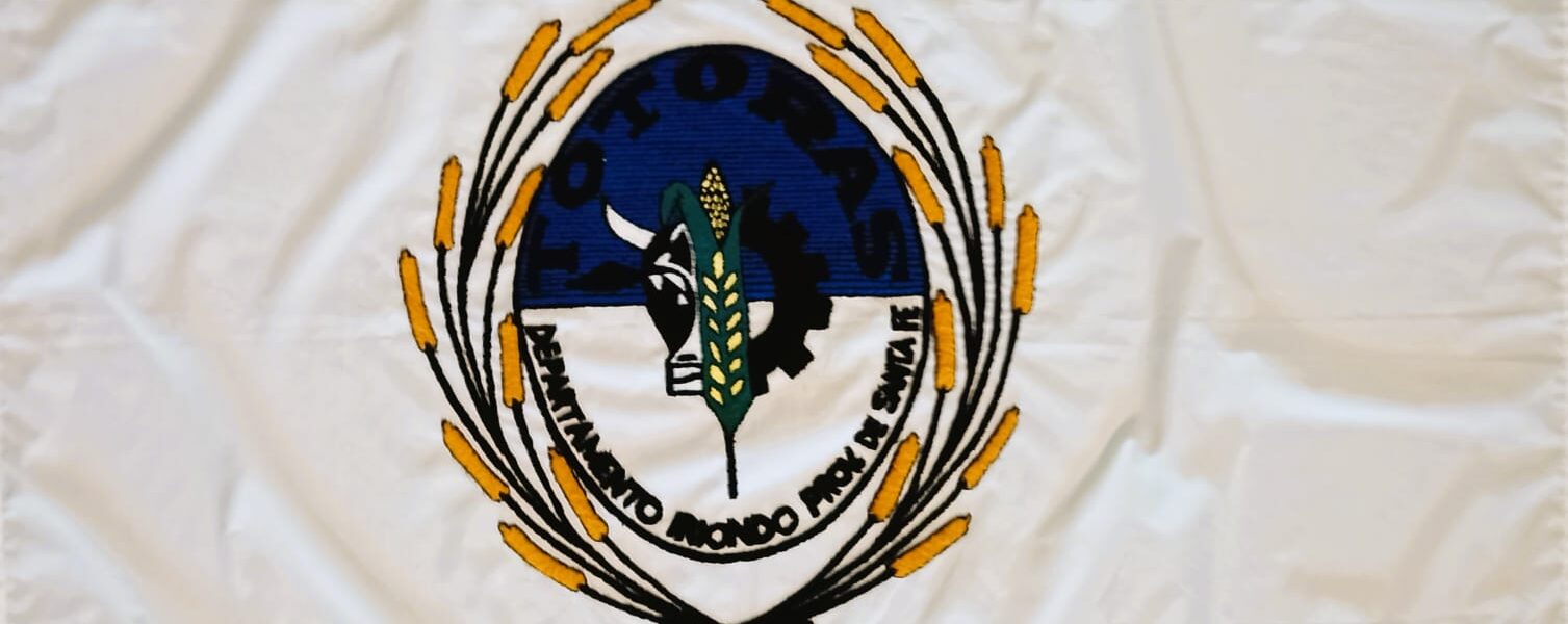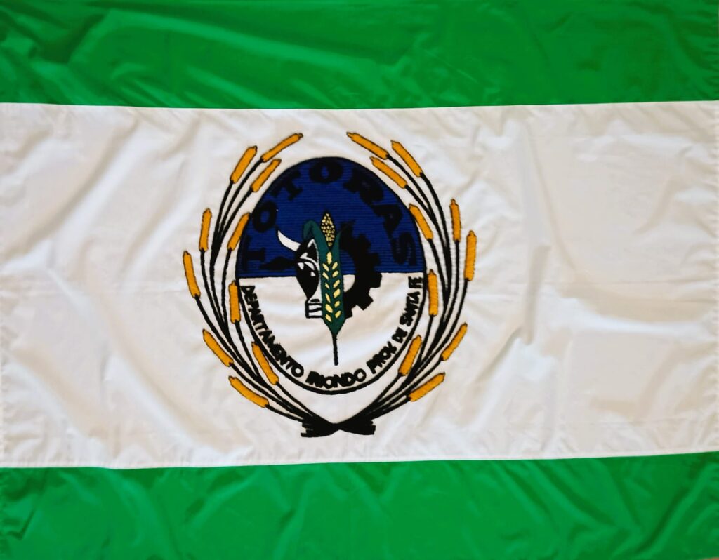 Dos bandas horizontales verdes y una blanca central con escudo local en su centro. Verde y blanco por el agro y la lechería. Centro con el escudo, nombre, espiga de trigo y maíz fundidas, cabeza de vaca y rueda dentada y la thypa o totora a los costados.