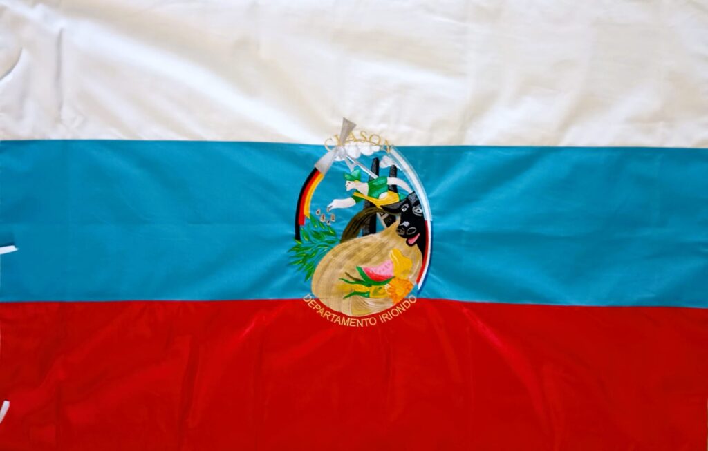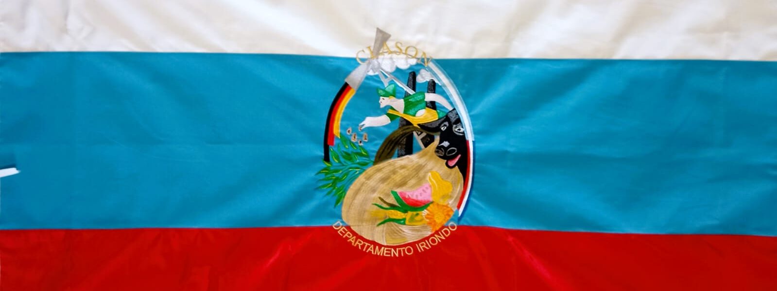Con fondo blanco, celeste y rojo, en el centro como un escudo los íconos locales con las actividades iniciales, agro y ganadería. Sembrador con semillas, bandera alemana, origen de los fundadores, bandera argentina y de la provincia y en dorado los nombres Clason y Santa Fe por la nobleza de los habitantes.