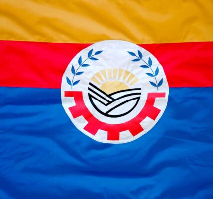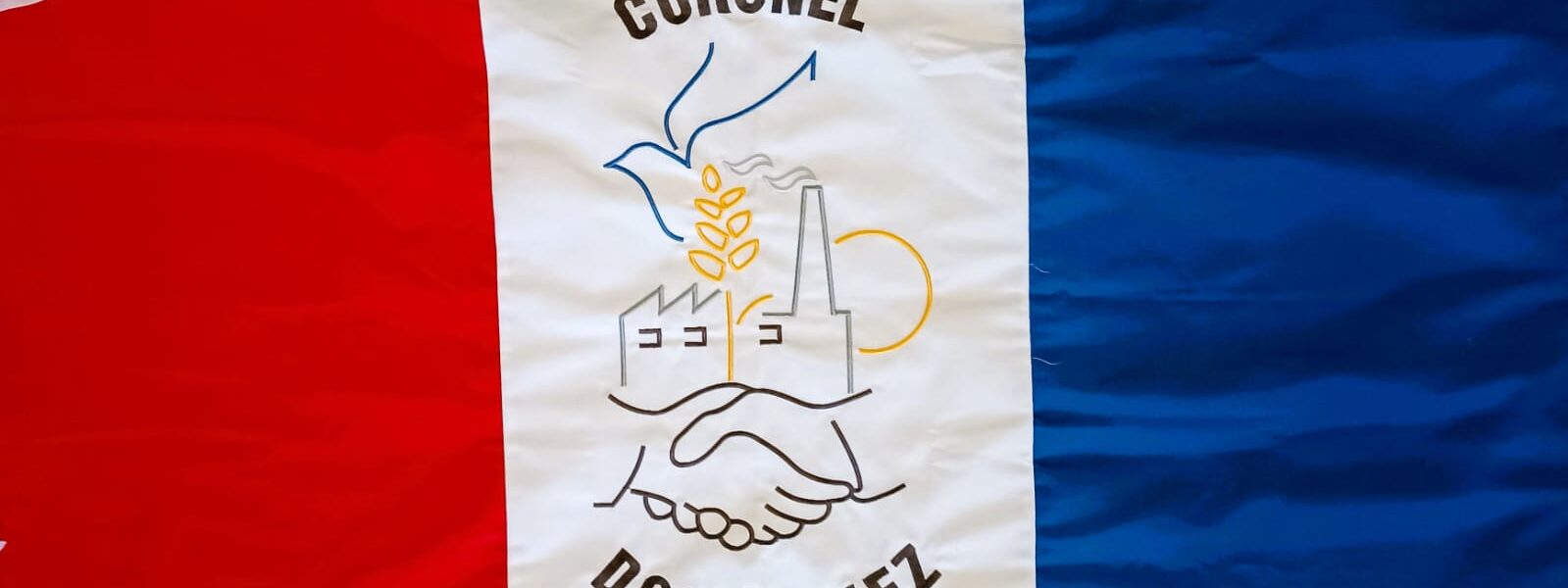 Tres franjas verticales, similares a la bandera de Santa Fe, azul, celeste cielo y la bandera nacional, roja similar al color de la institución deportiva local y en el centro el dibujo representa el trabajo, la paz, unión y esperanza del sol naciente.
