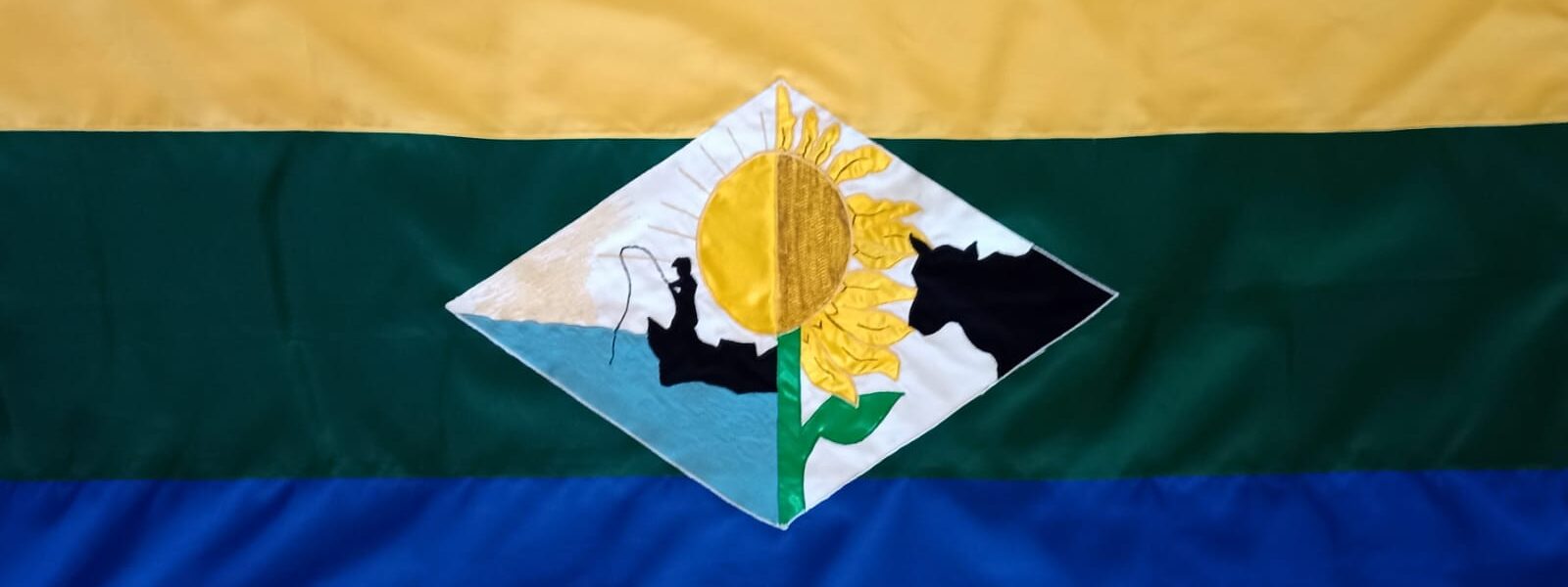 Tres franjas horizontales: la verde, representa el campo y el ganado, una amarilla, el sol y el girasol y otra celeste, el agua y el turismo. En el centro representados sus cultivos, la ganadería y la pesca.