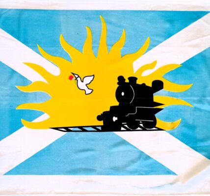 Como centro partiendo desde el ángulo inferior izquierdo surgen las vías del ferrocarril de manera estilizada, representando nuestras raíces como pueblo netamente ferroviario y